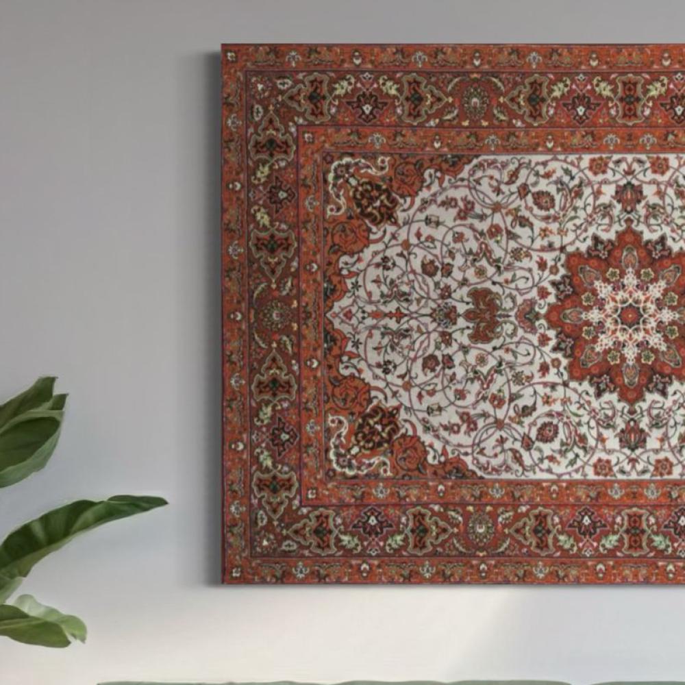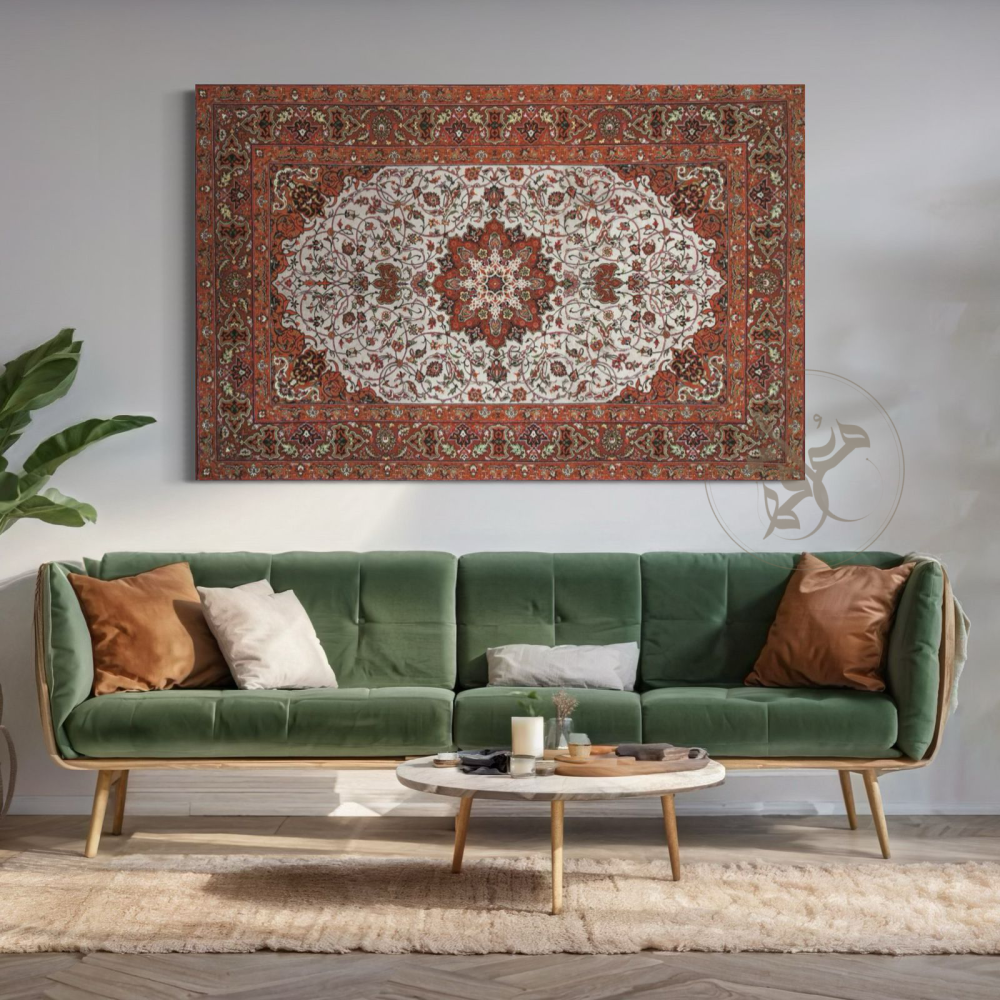 لوحة فنية مخملية بزخارف مستوحاة من السجاد، بلون برتقالي دافئ يضفي إشراقاً وأناقة على ديكور الجدران. مثالية لتزيين المساحات الداخلية في المنازل الفاخرة أو الفنادق الراقية. يمكنك تصميمها حسب ذوقك، مع اختيار المقاس المناسب وكتابة عبارتك الخاصة بالأحرف البارزة أو المطبوع.